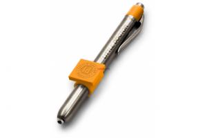 Удобен в использовании и ношении, включается легким нажатием на клипсу, имеет форму авторучки.